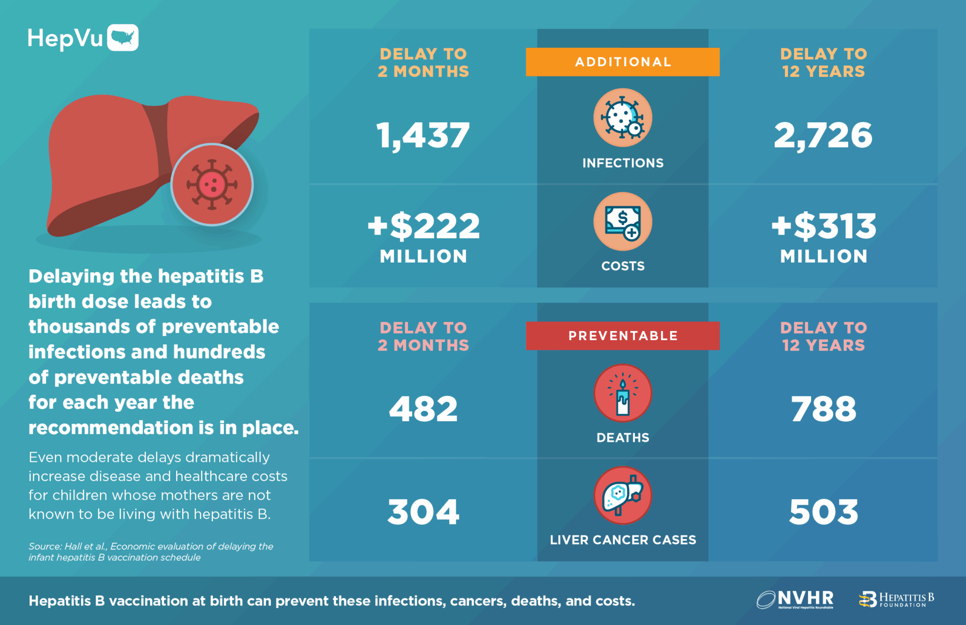 - By delaying the birth dose to 2 months among infants whose mothers are not known to be living with hepatitis B, there could be at least 1,400 preventable hepatitis B infections among children, 300 excess cases of liver cancer, 480 preventable deaths and over $222 million in excess healthcare costs, for each year the revised recommendation is in place.